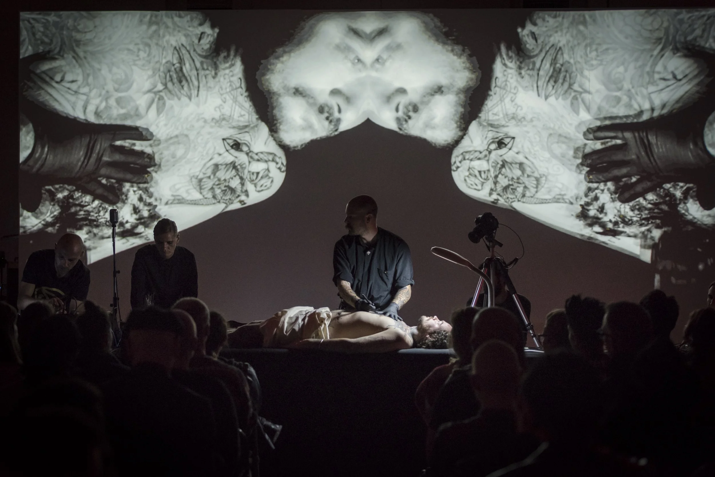 The sound of the needle touching the skin gets amplified and enhanced, processed through effects it gets designed and sculpted by the sound artists of the group.