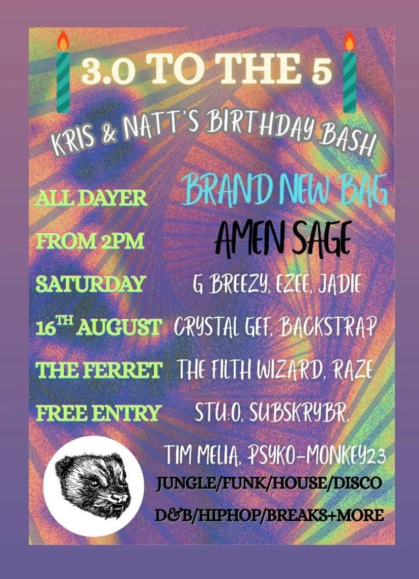 Catch these lovely people at #TheFerret this weekend: Brand New Bag, Amen Sage, G Breezy, Ezee, Jadie, Crystal GEF, Backstrap, The Filth Wizard, Raze, Stu.0, Subskrybr, Tim Melia, Psyko-Monkey23
