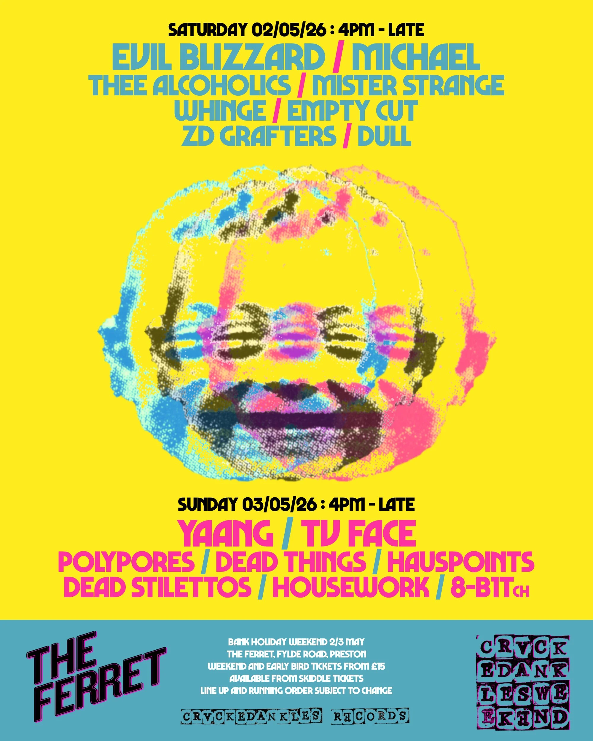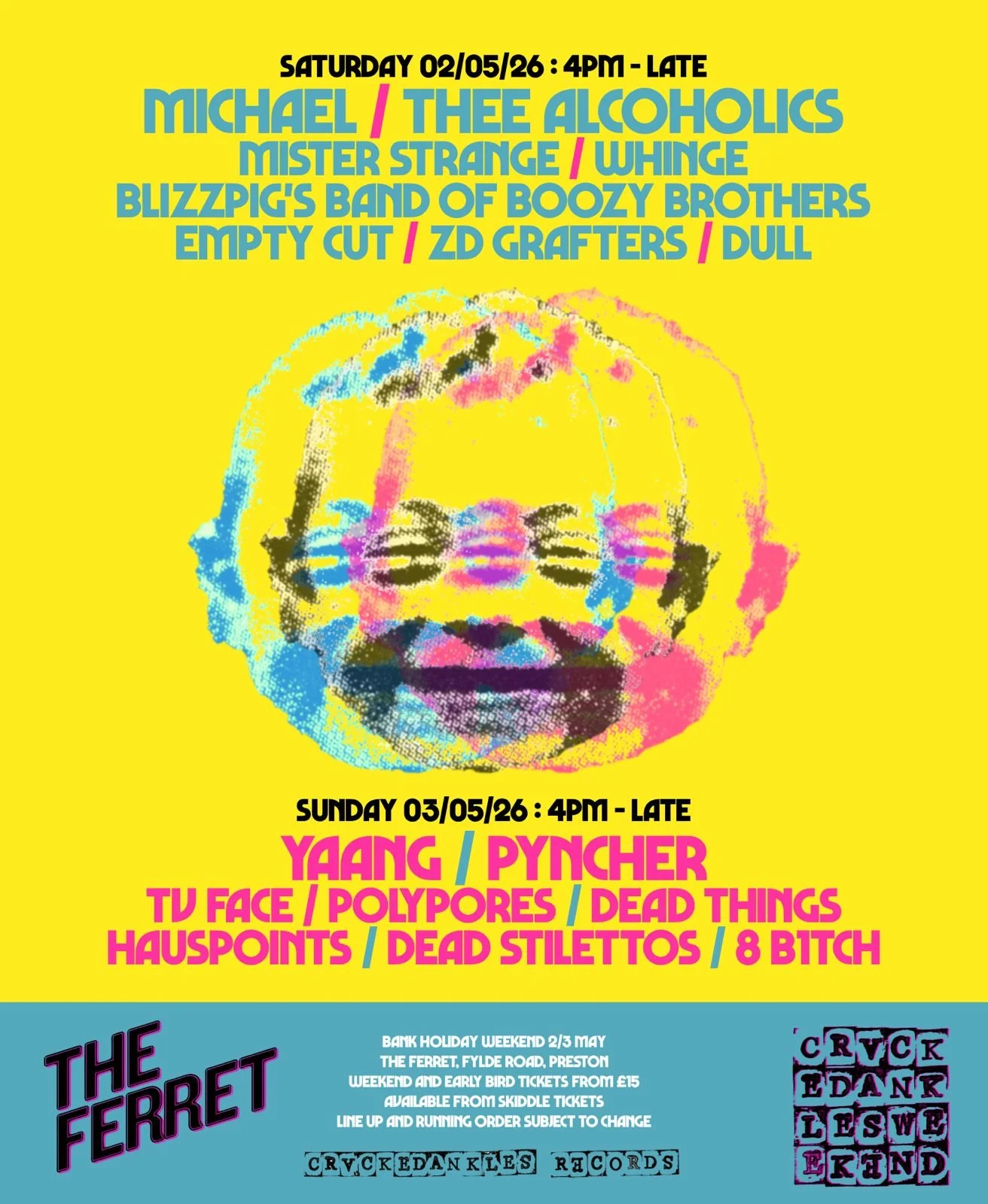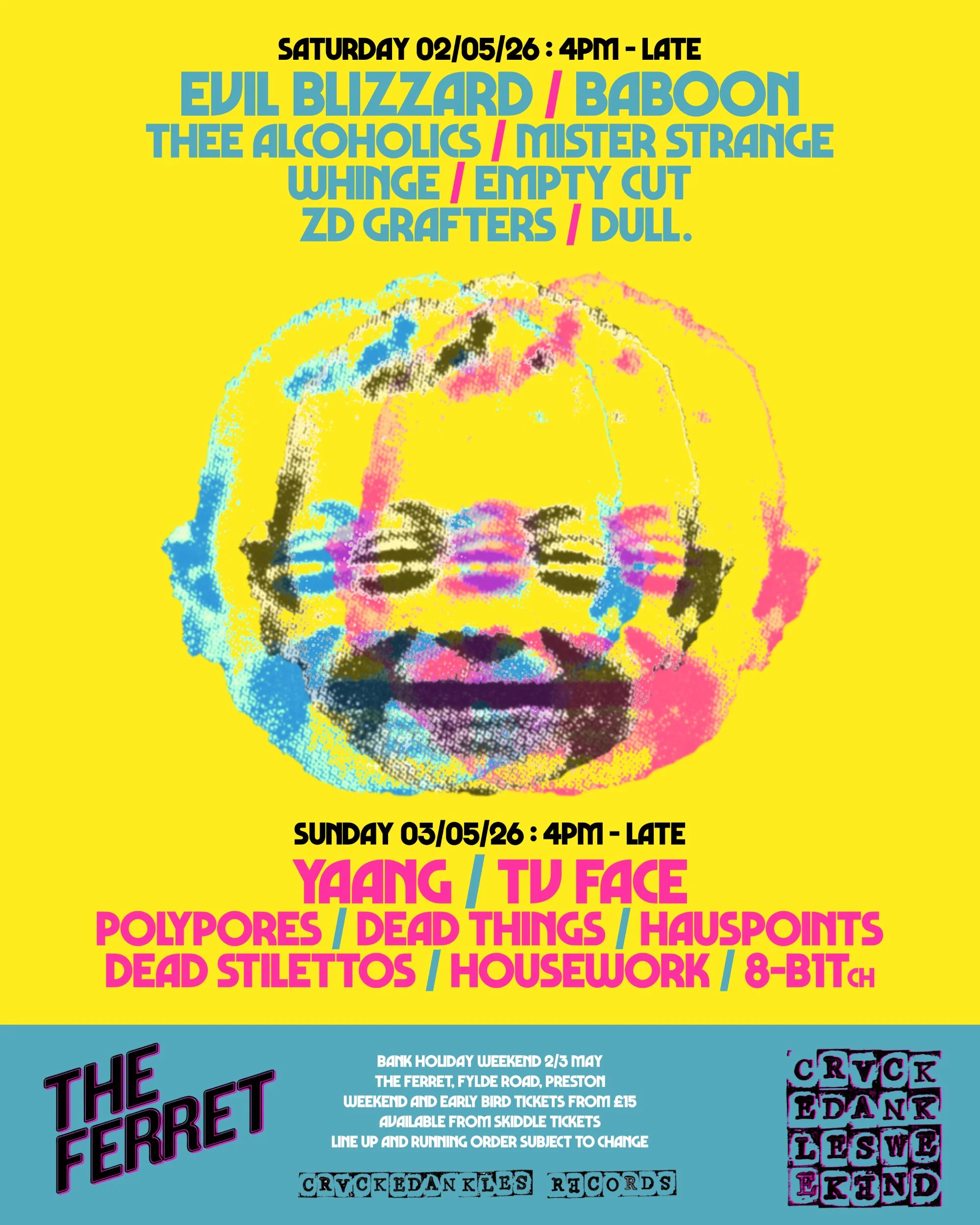 Following the resounding success of last year's sold out weekend, Preston's CRACKEDANKLES RECORDS takeover their spiritual home at The Ferret for another weekend showcasing most of their acts, and a few others.