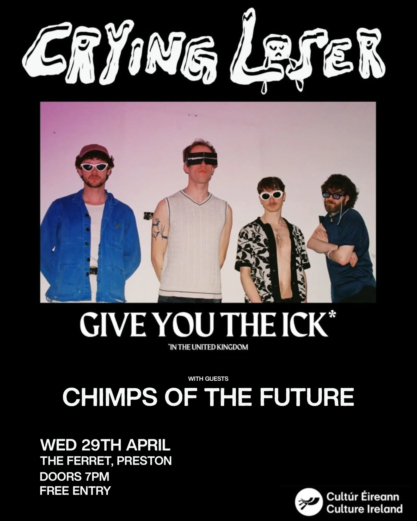 A no-wave quartet comprised of Arthur Pawsey (guitar, vocals), Micheál Fitzgerald (bass), Sam Clague (bass clarinet, flute) and Ruairí de Búrca (drums), Crying Loser released their first EP, Oaf Milk in September 2023, with a vinyl release by Swish Swash Records following in 2024. Following two successful tours across France and multiple shows all over Ireland & UK, Crying Loser’s upcoming full length album The Ick, pushes the limits of the groups’s chaotic and feverish compositions.