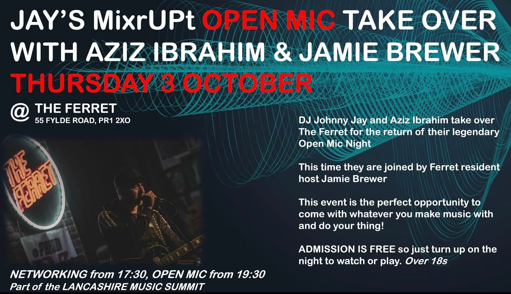 DJ Johnny Jay and Aziz Ibrahim take over The Ferret for the return of their legendary Open Mic Night as part of the LANCASHIRE MUSIC SUMMIT