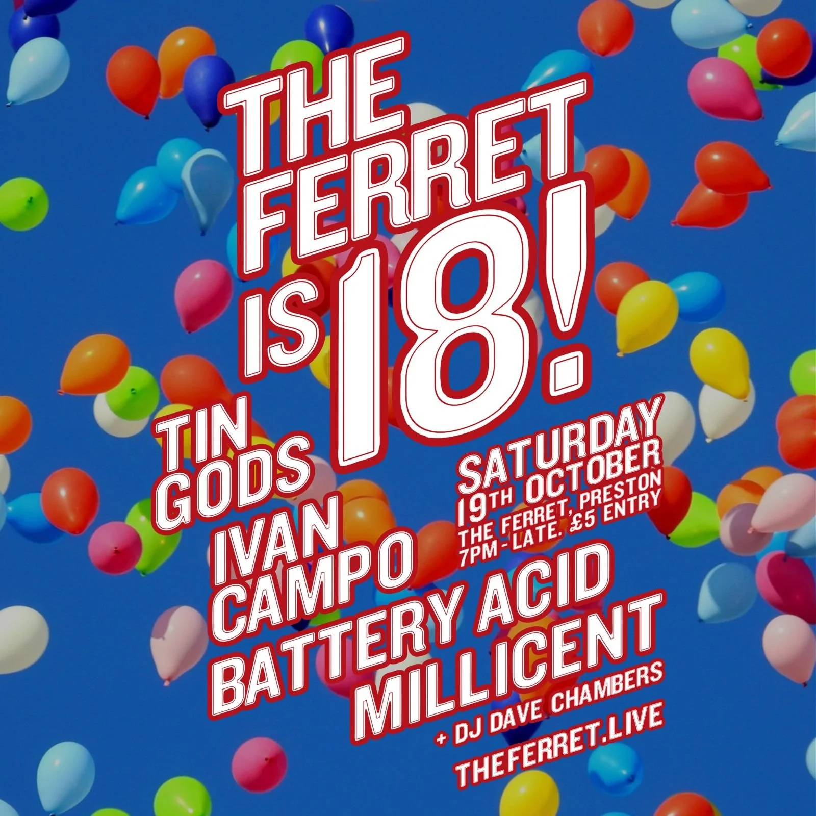 Joining us for the party are Friends of The Ferret: Tin Gods, Ivan Campo & Millicent, plus new friends Battery Acid from Bristol.