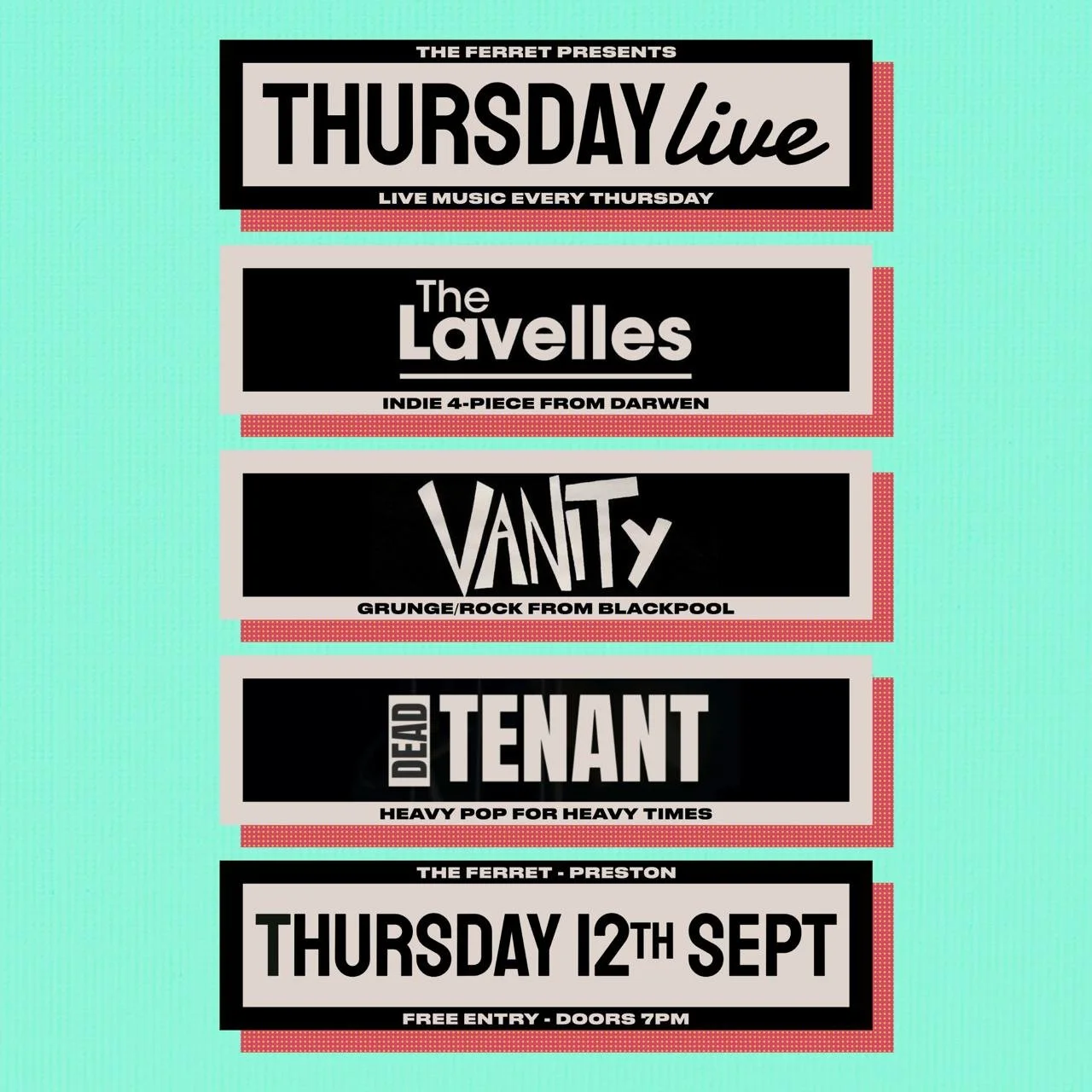 We’re back this Thursday 12th September with an eclectic little lineup in the form of The Lavelles, Vanity & Dead Tenant.